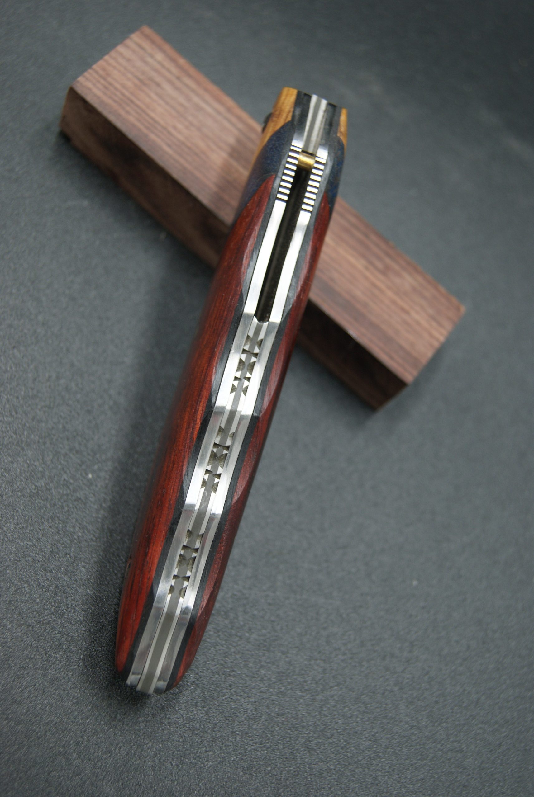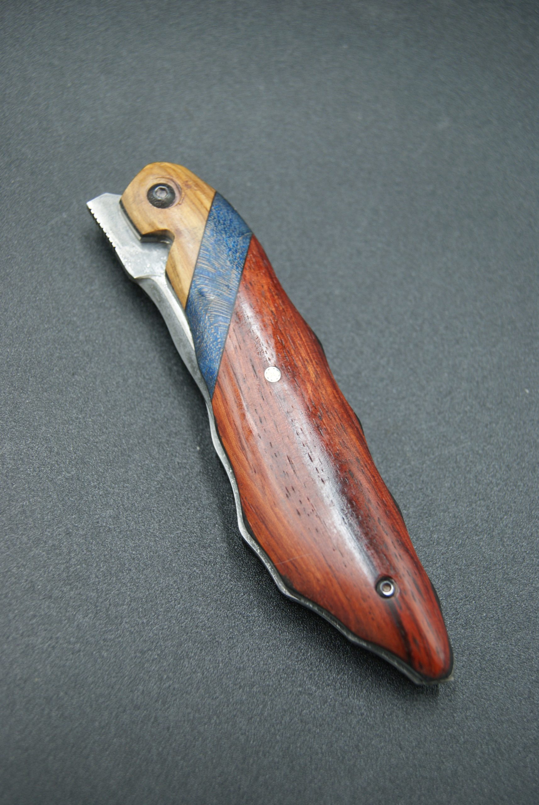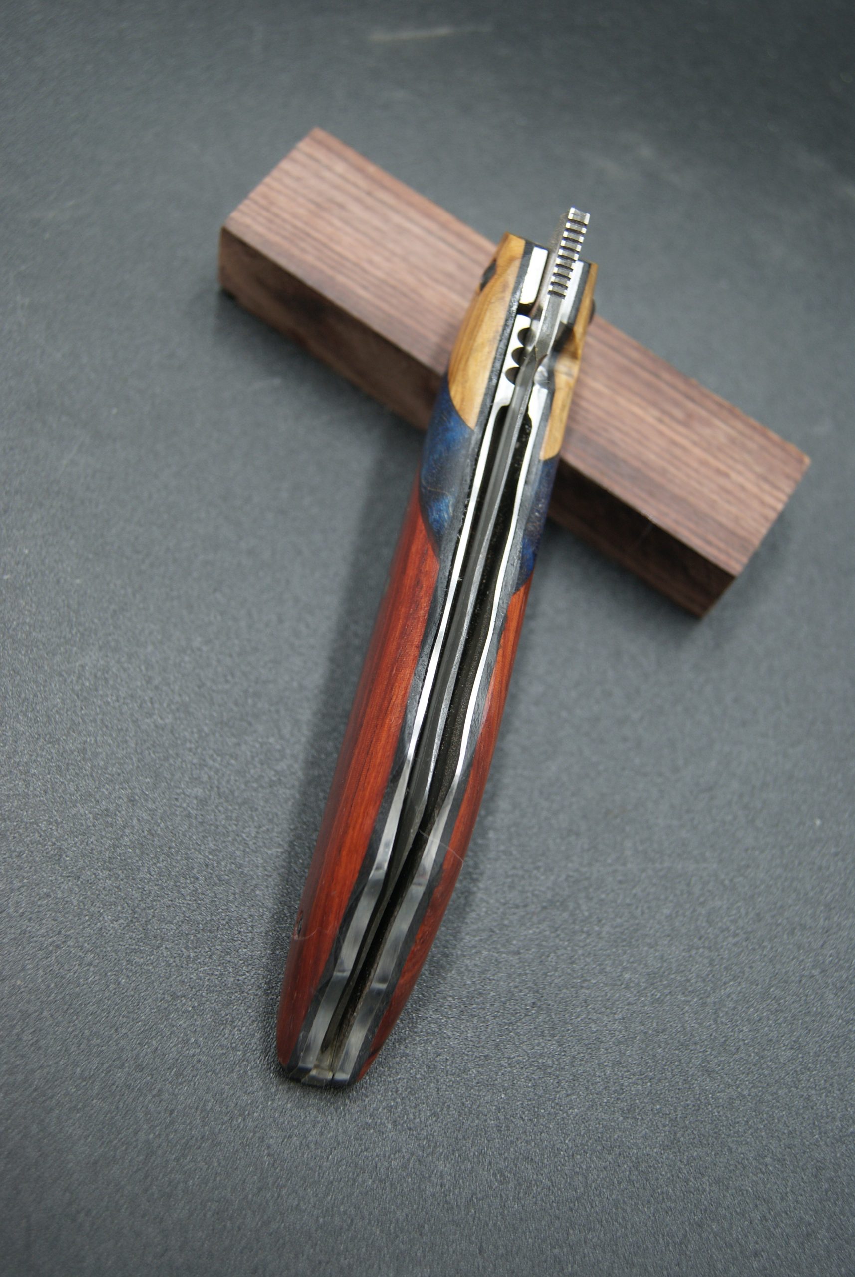 - Composition manche : Intercalaire G10 noir, olivier du maroc, épicéa ondé stabilisé pigmenté bleu, racine de narra mauve