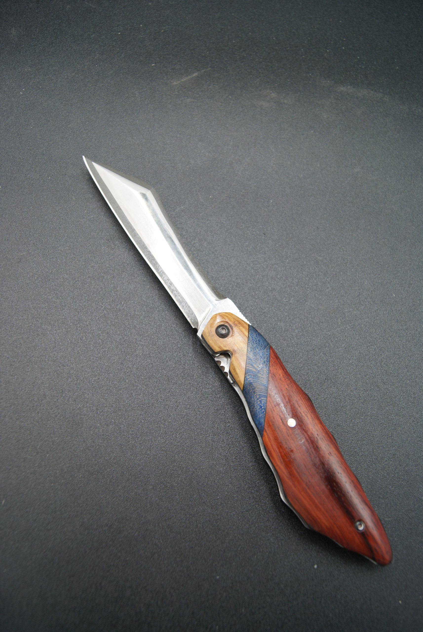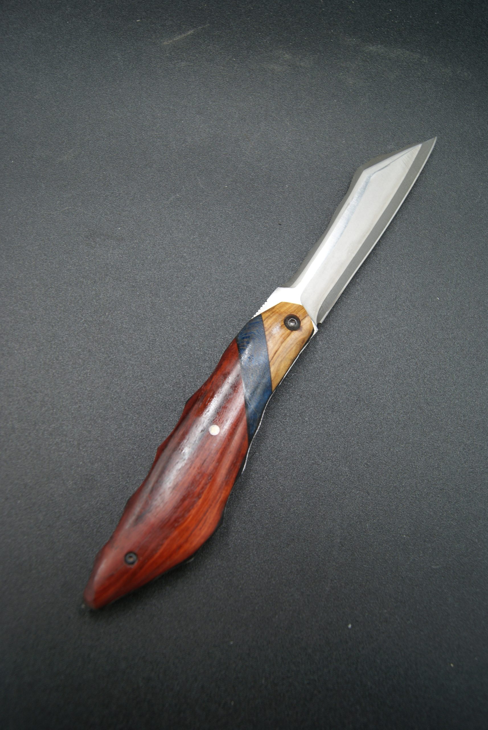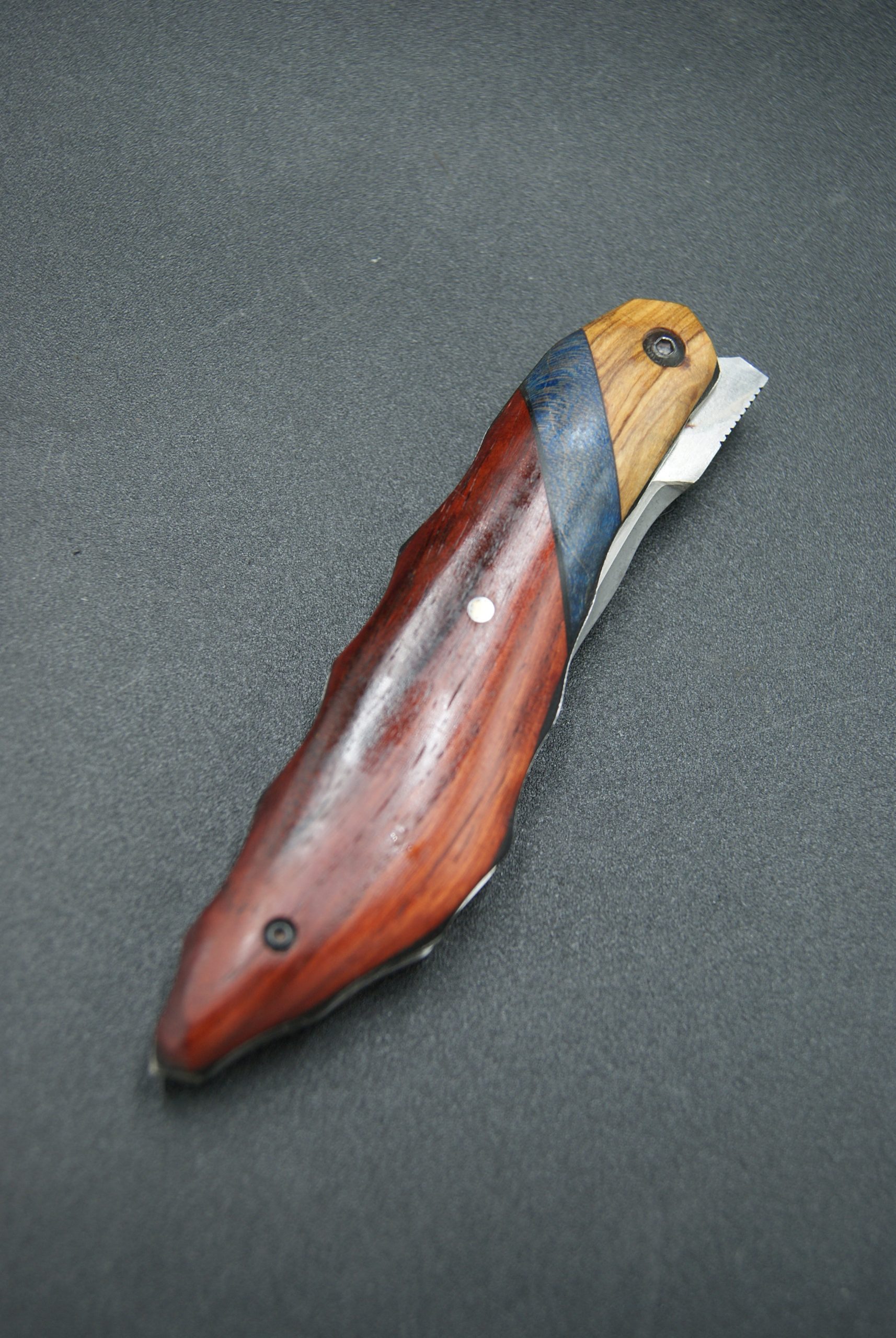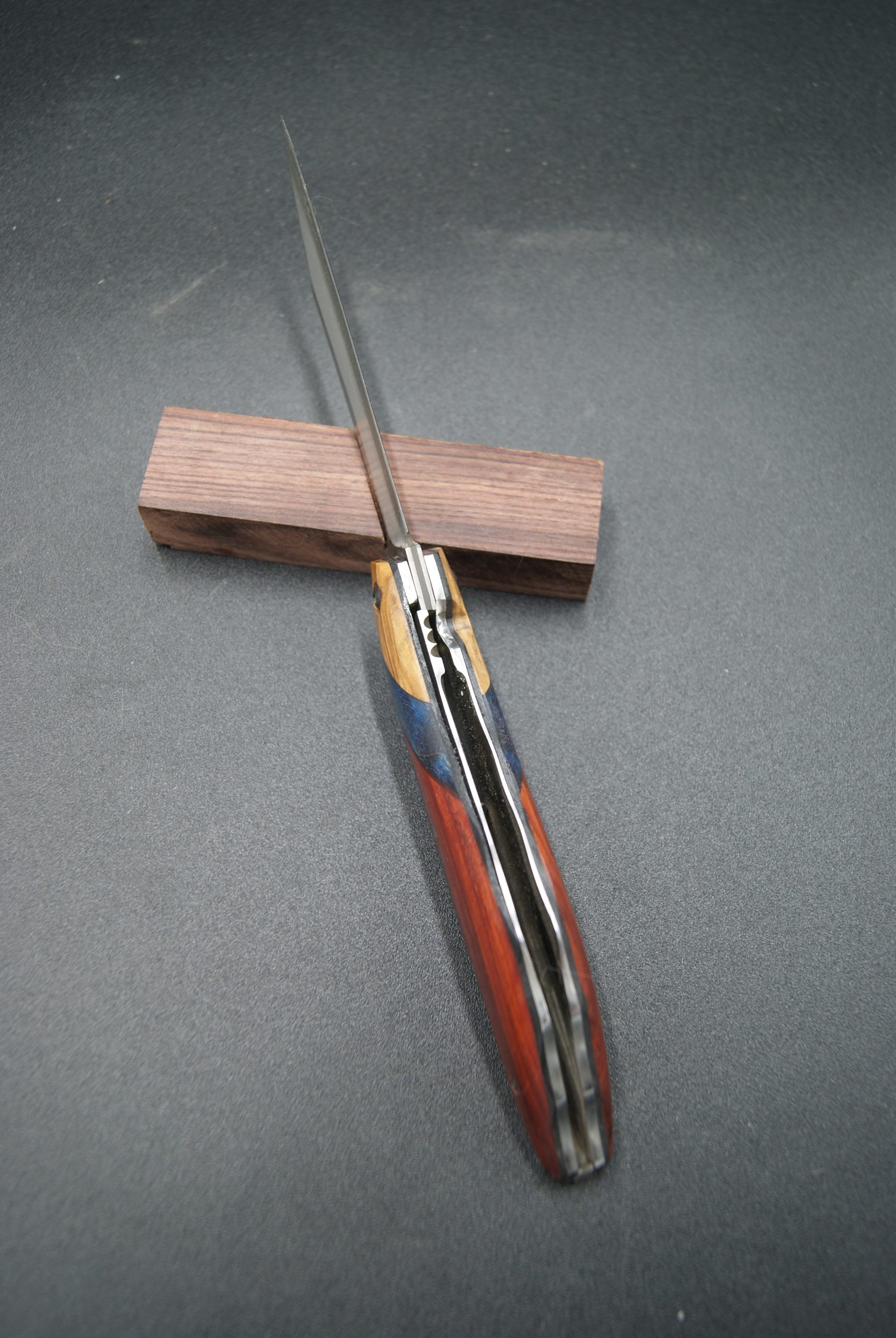 - Composition manche : Intercalaire G10 noir, olivier du maroc, épicéa ondé stabilisé pigmenté bleu, racine de narra mauve