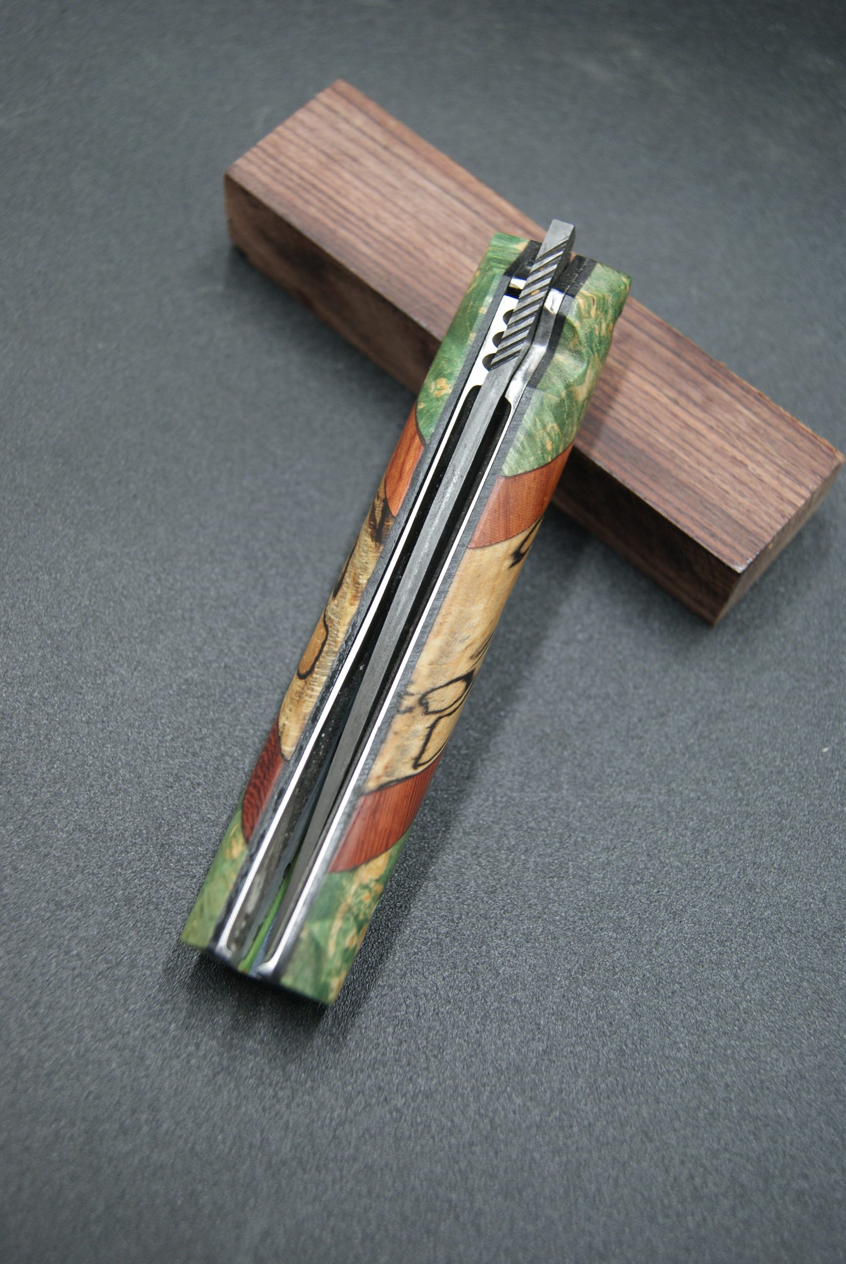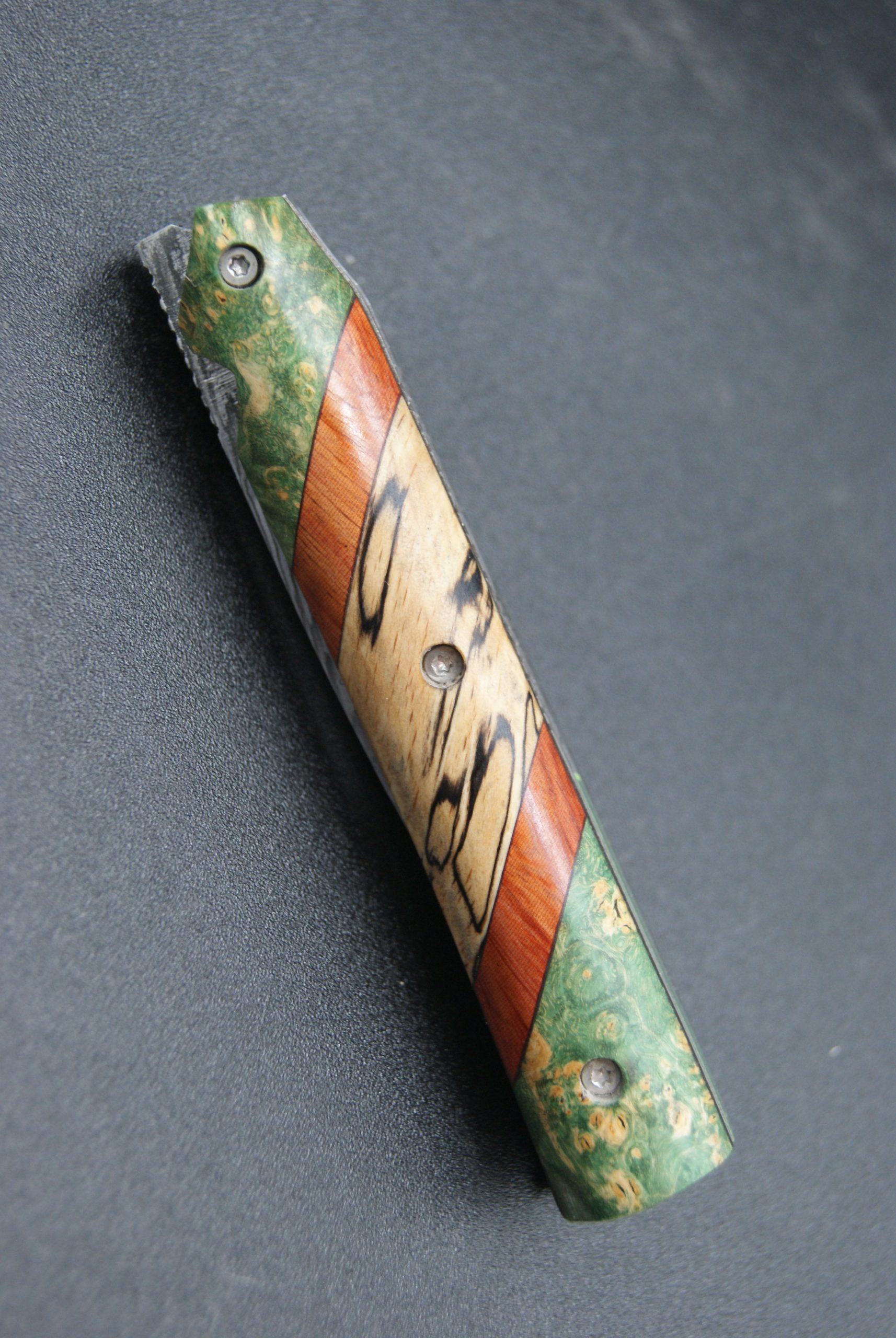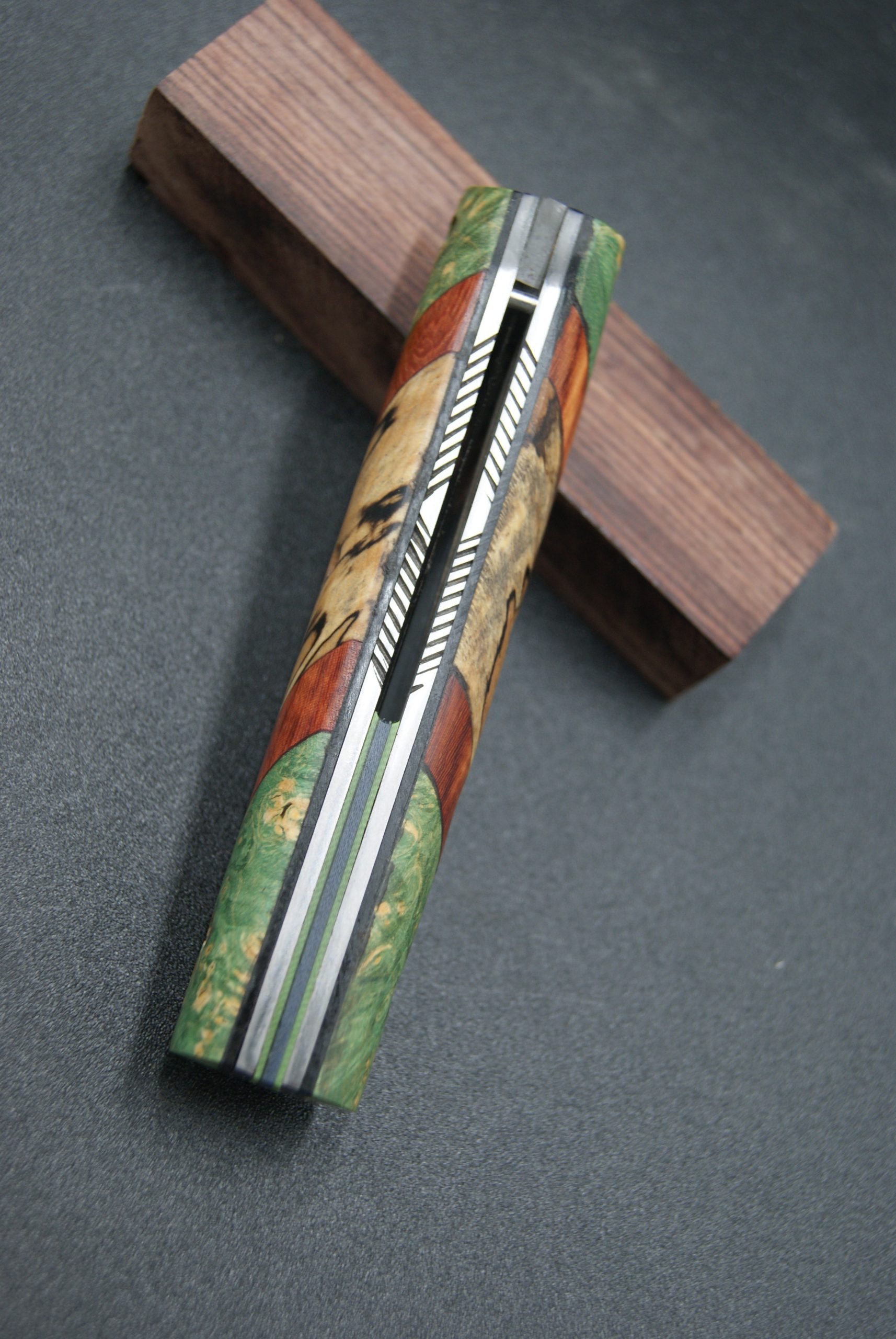 - Composition manche : Intercalaire G10 noir, loupe d'érable stabilisée et pigmentée vert, bois de rose et hêtre échauffé