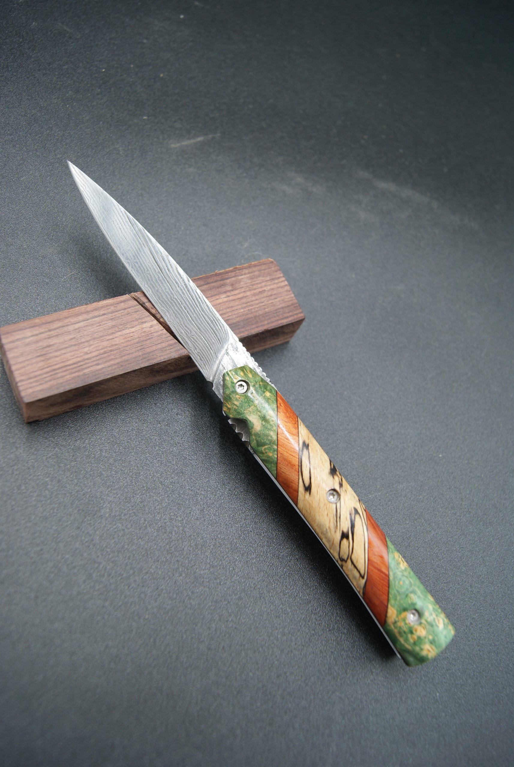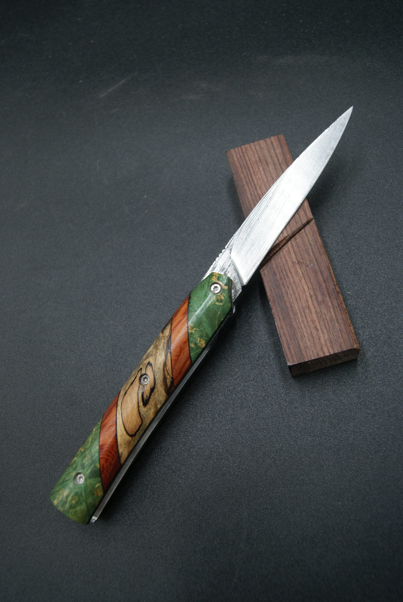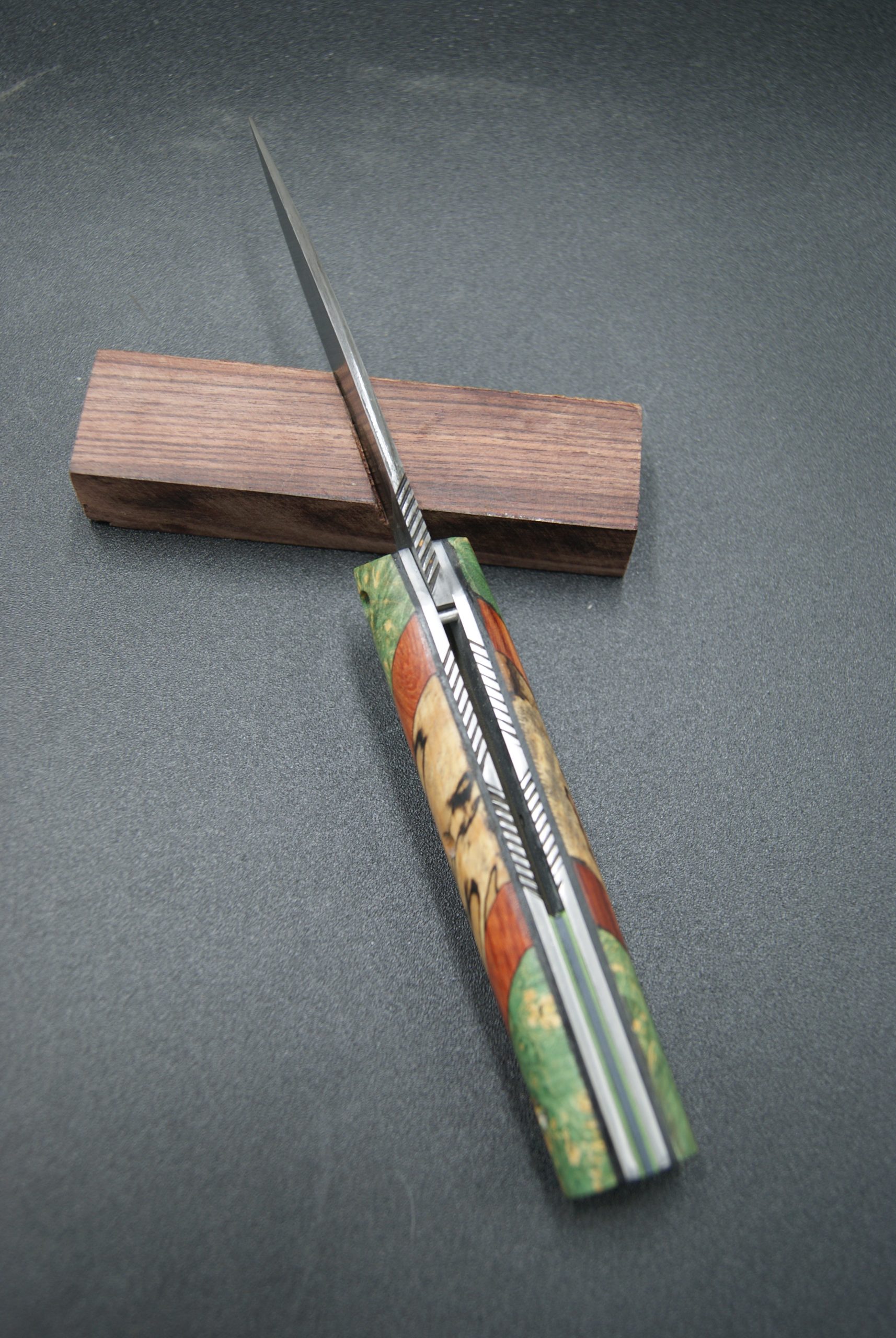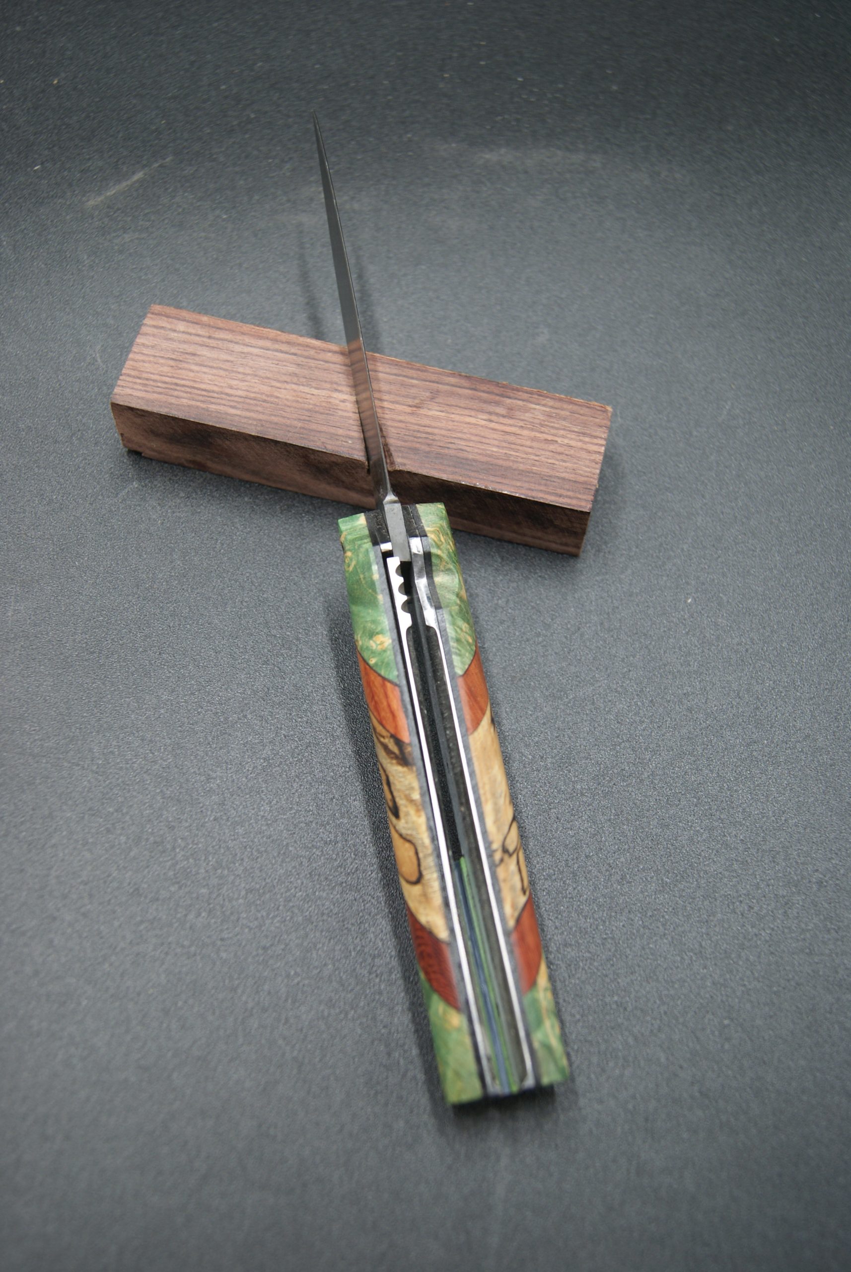 - Composition manche : Intercalaire G10 noir, loupe d'érable stabilisée et pigmentée vert, bois de rose et hêtre échauffé