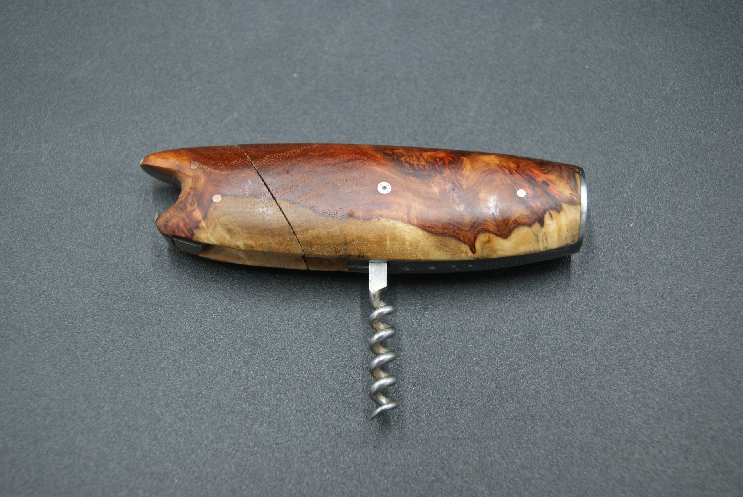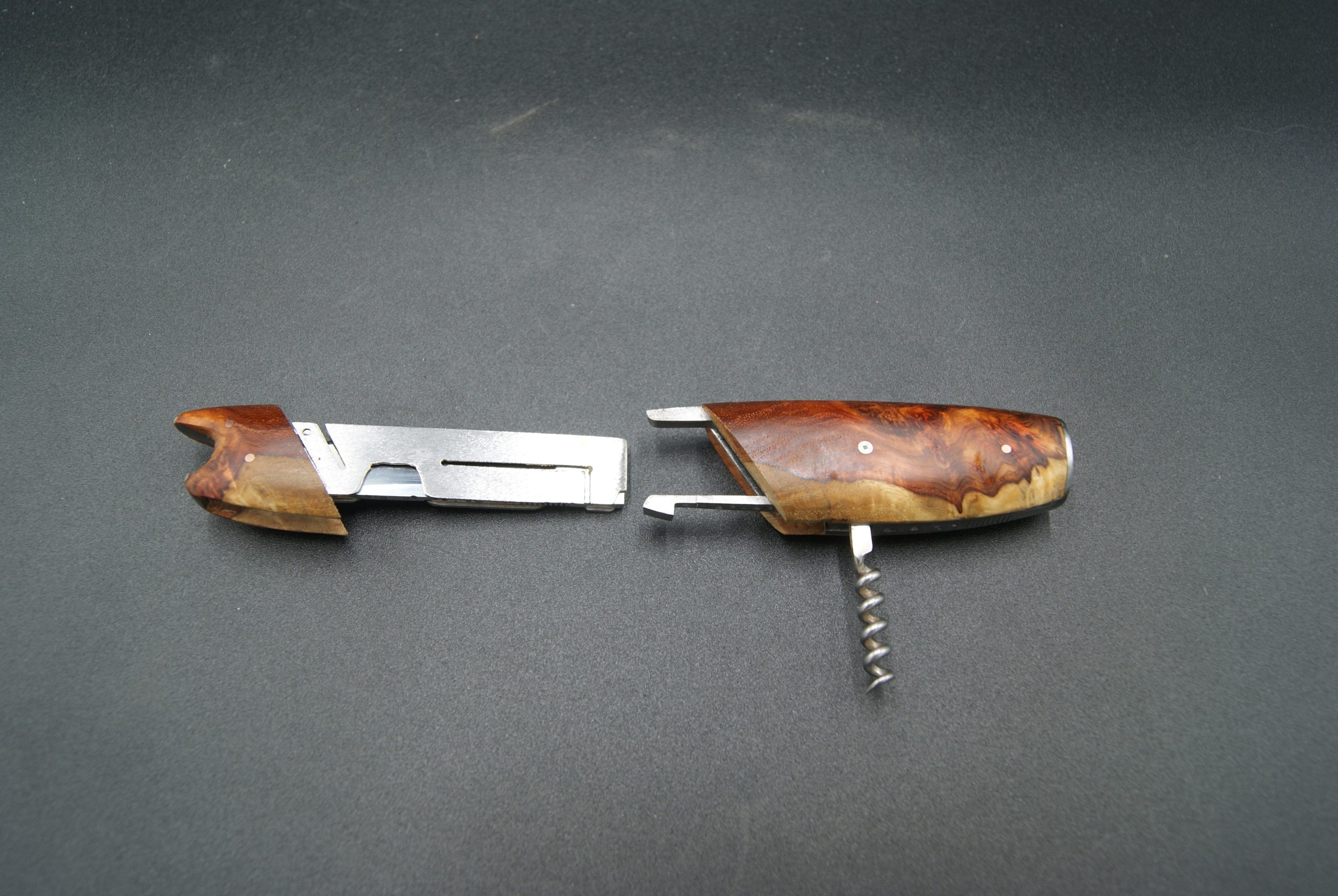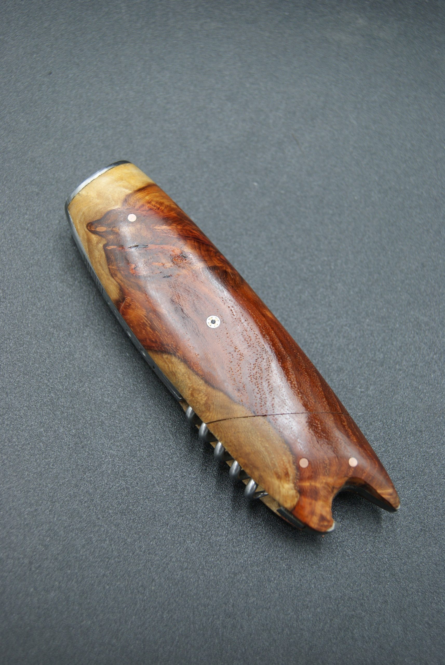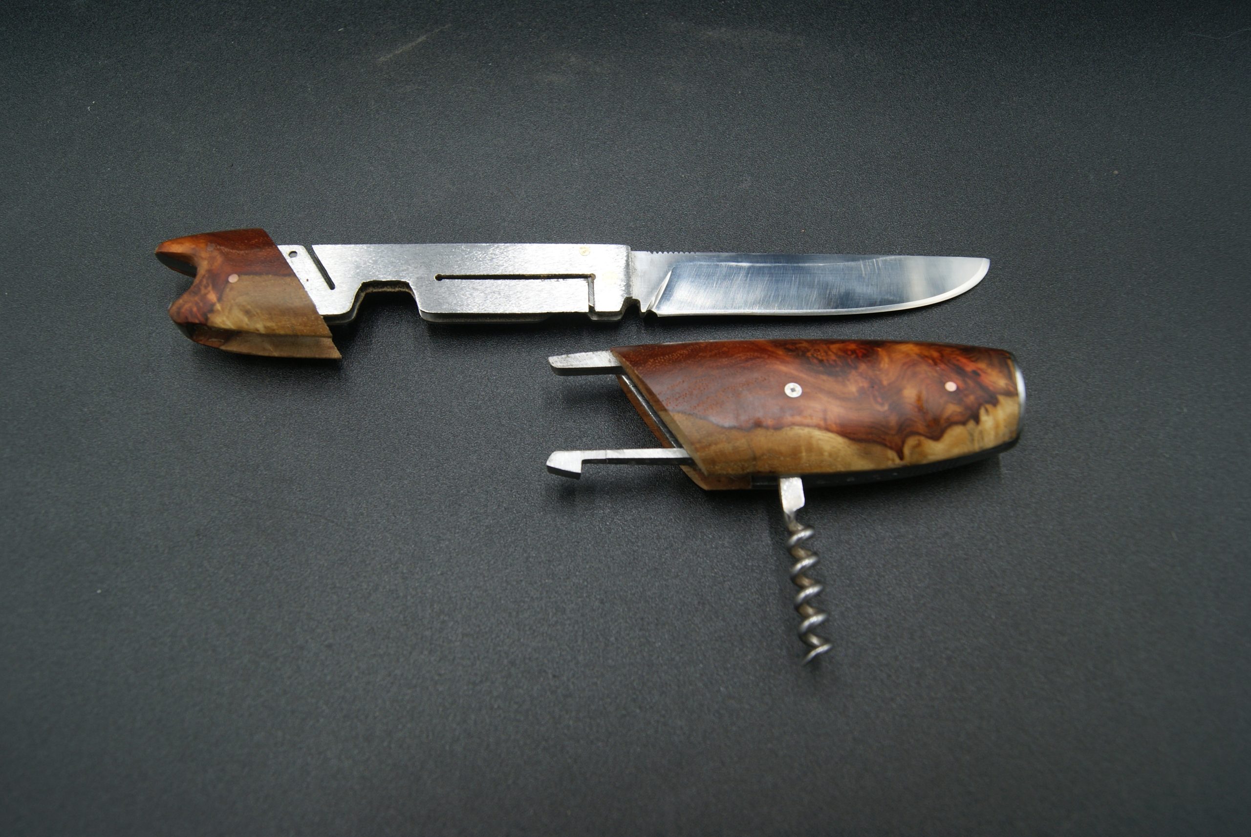 Couteau tonneau, couteau pliant par glissement avec le manche qui fait aussi office d’étui.