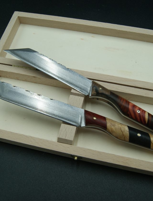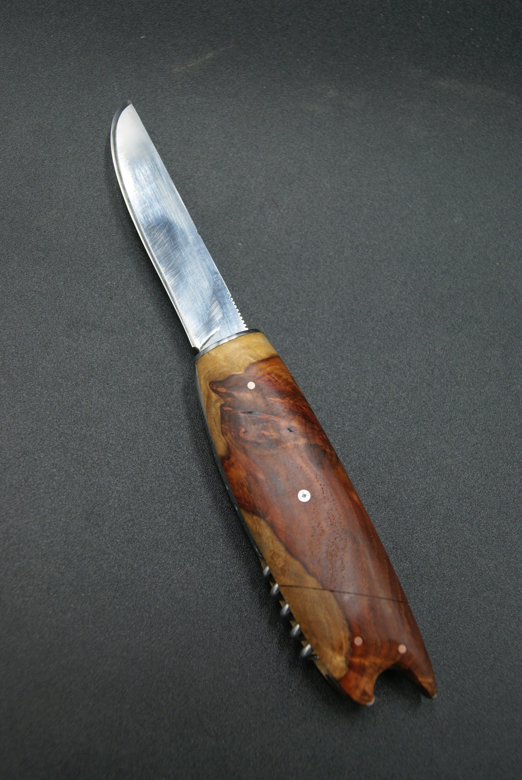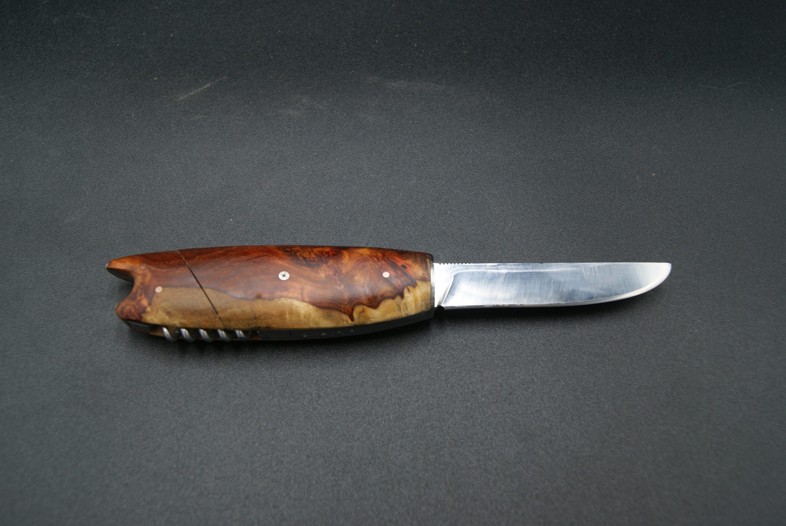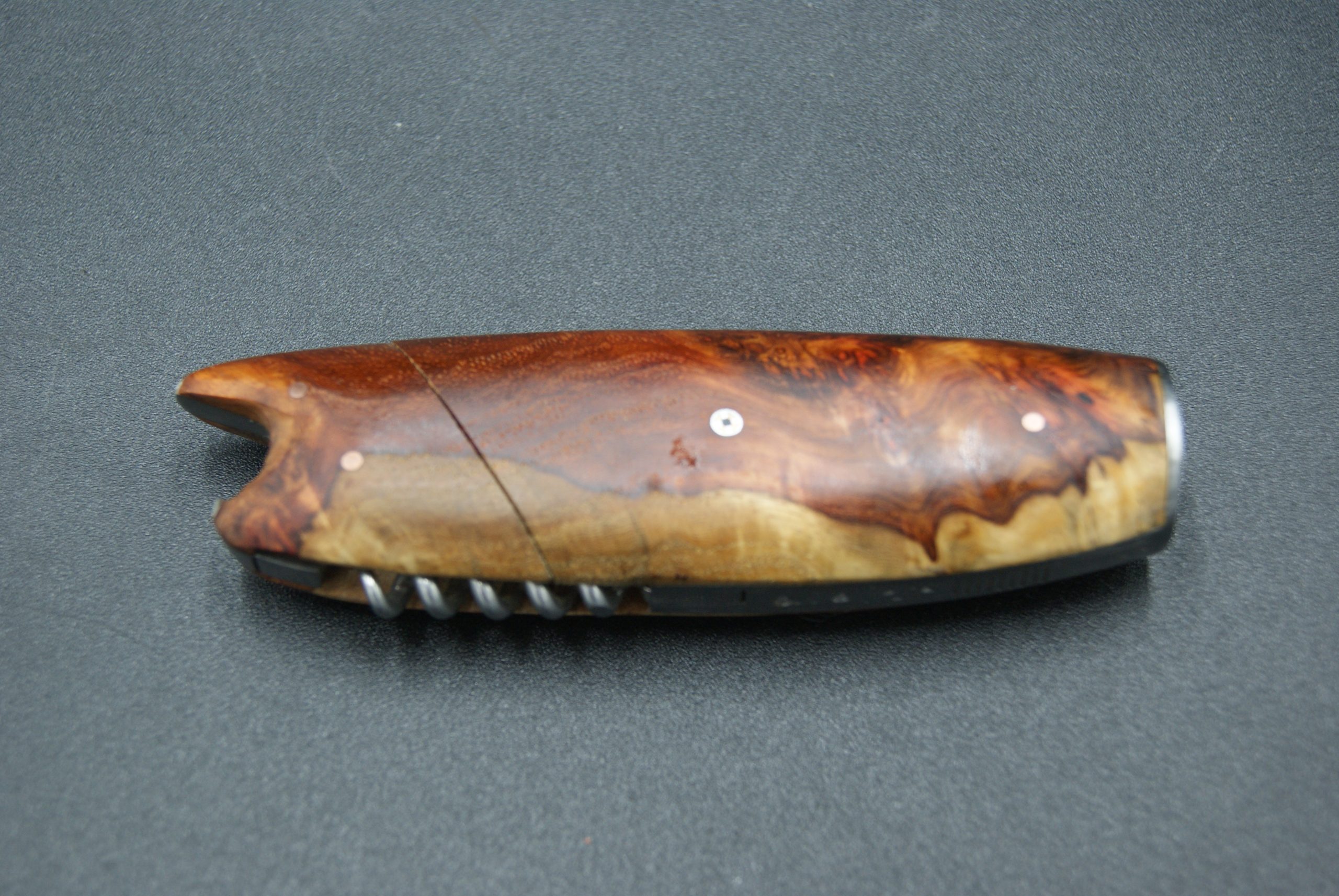 Couteau tonneau, couteau pliant par glissement avec le manche qui fait aussi office d’étui.