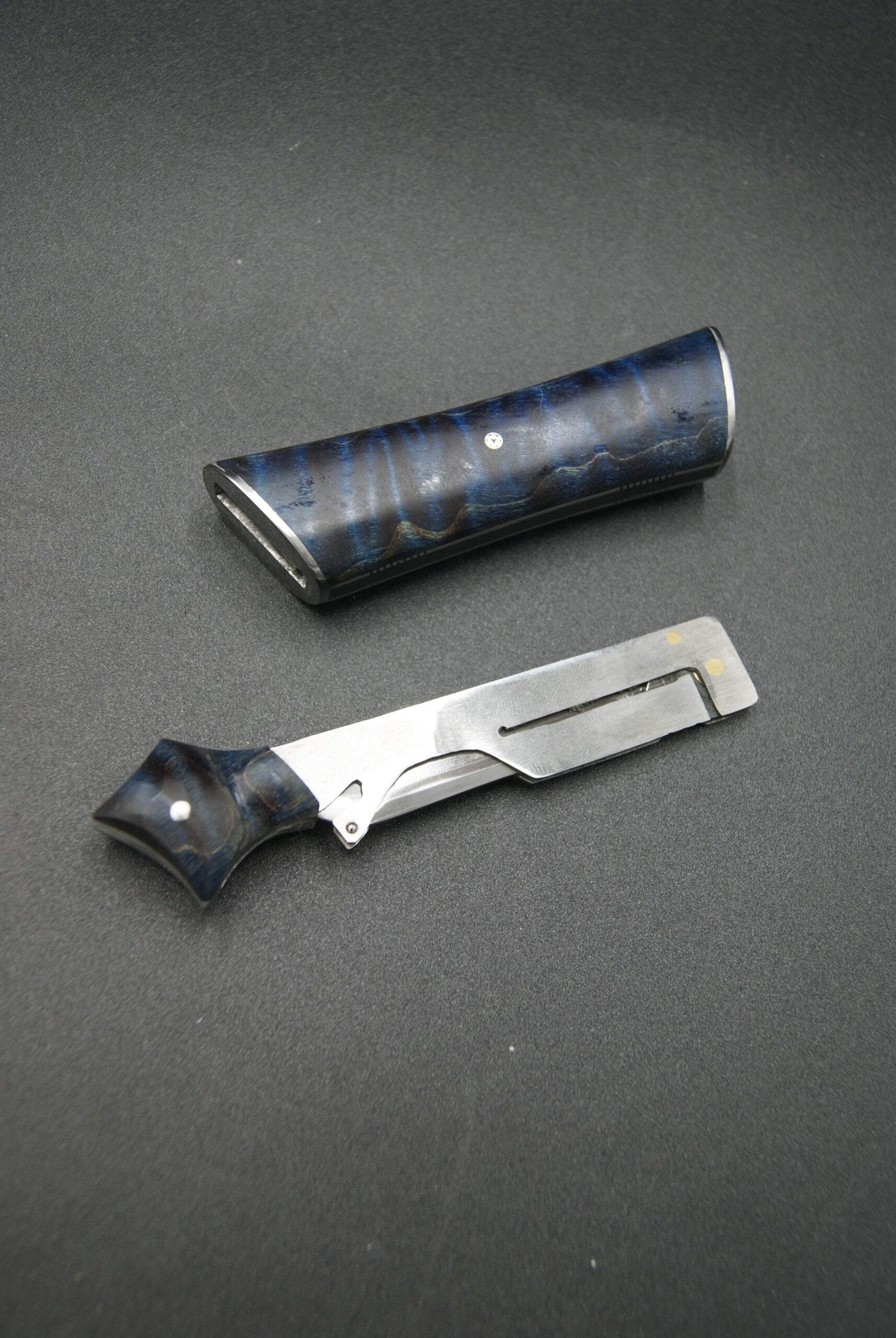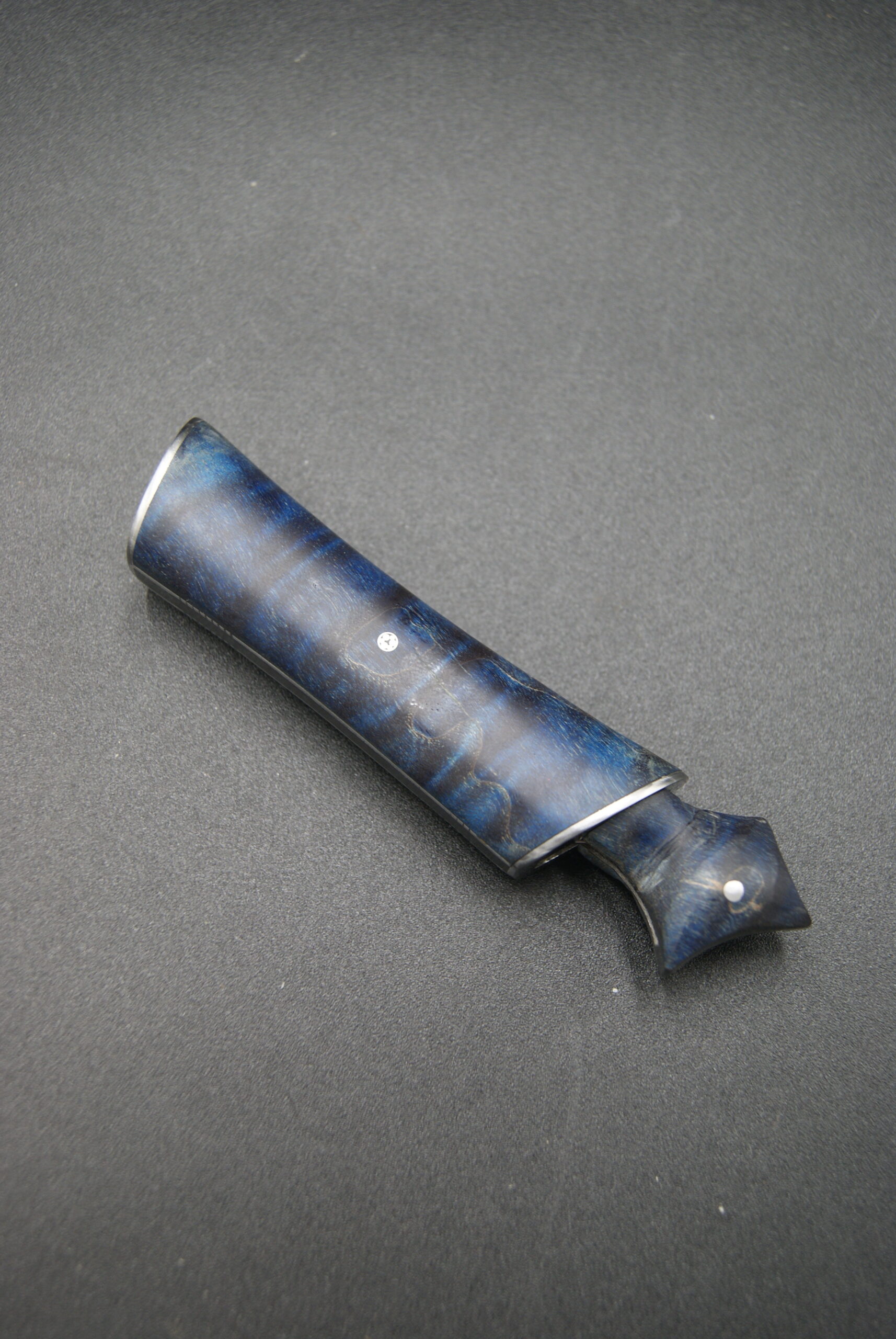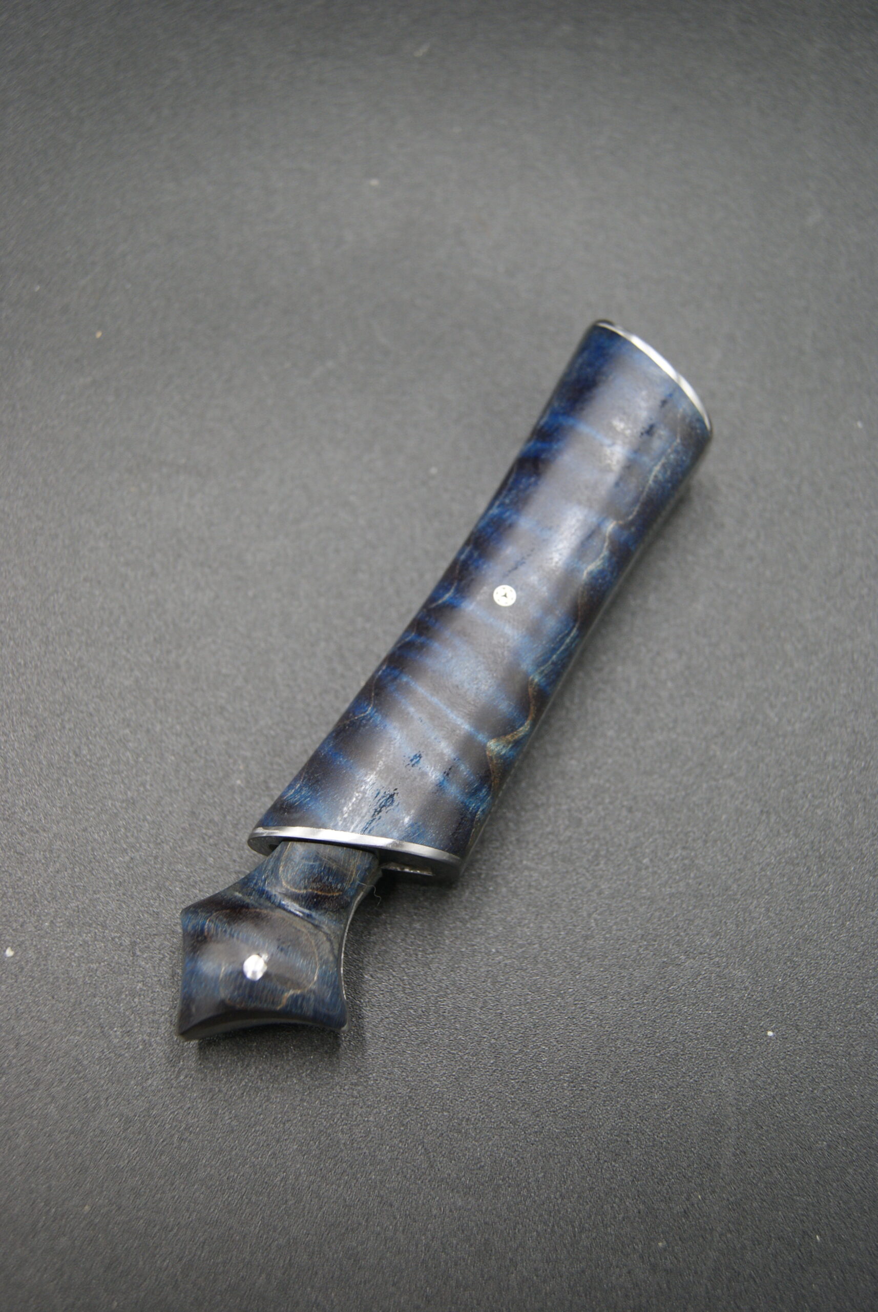 - Composition manche : Erable ondé stabilisé, pigmenté bleu, et ébène