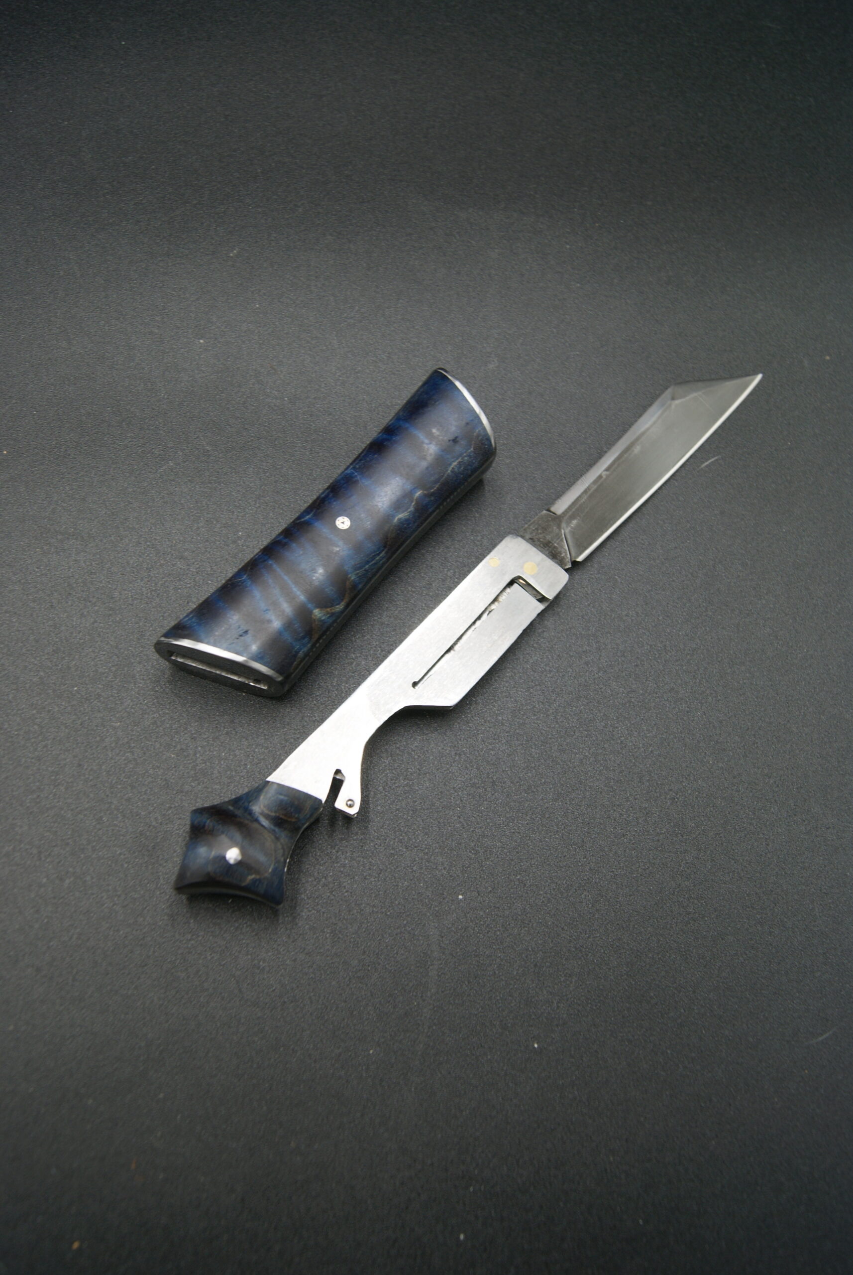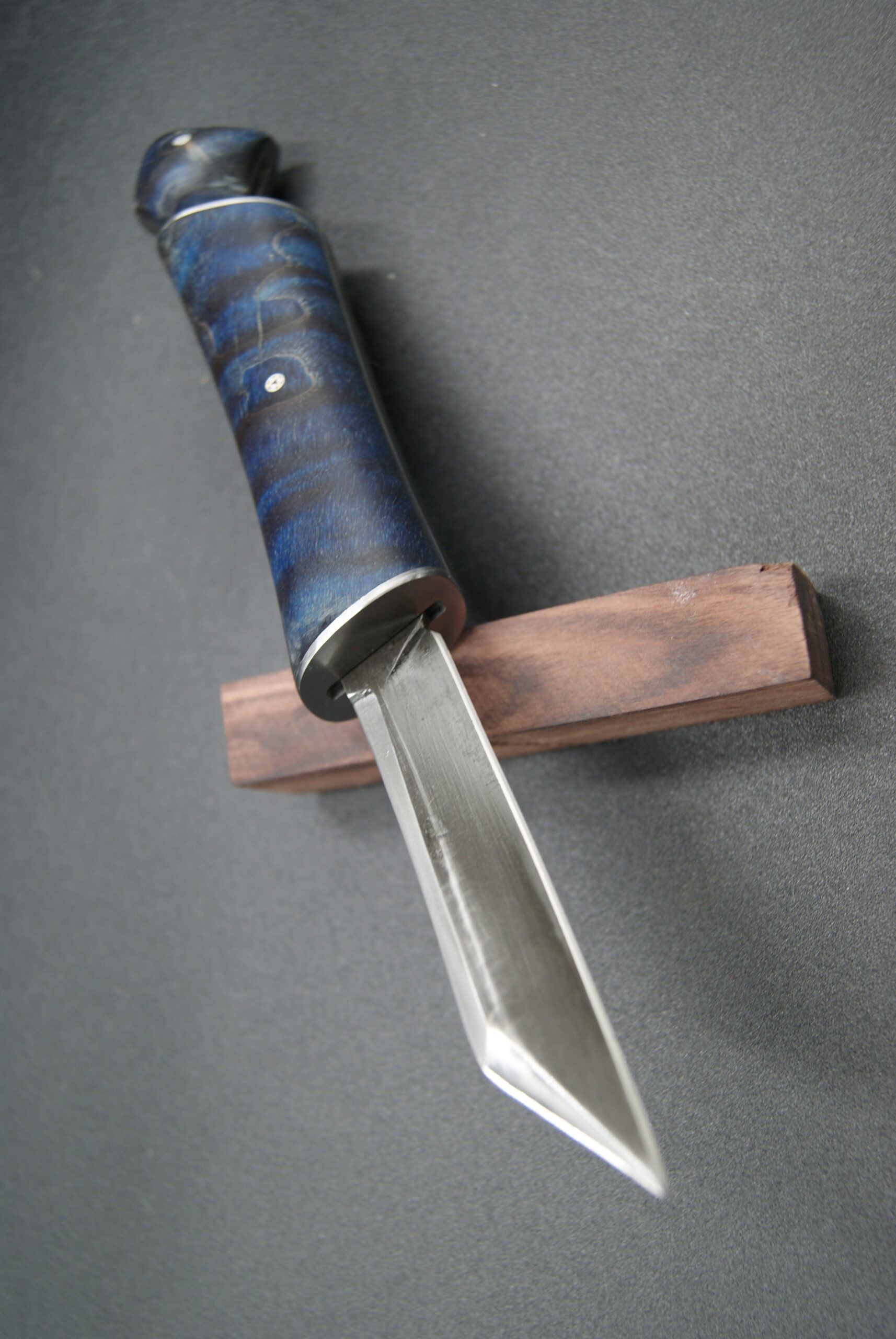 Lame en acier carbone (qui rouille) en 90MCV8, patinée au perchlo plus.