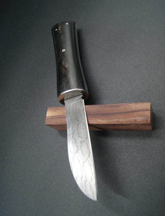 Lame en acier damas carbone 600 couches artisanal (qui rouille), forgé par Mathieu GABET de l’Atelier Des Lacs en XC75 et 15N20